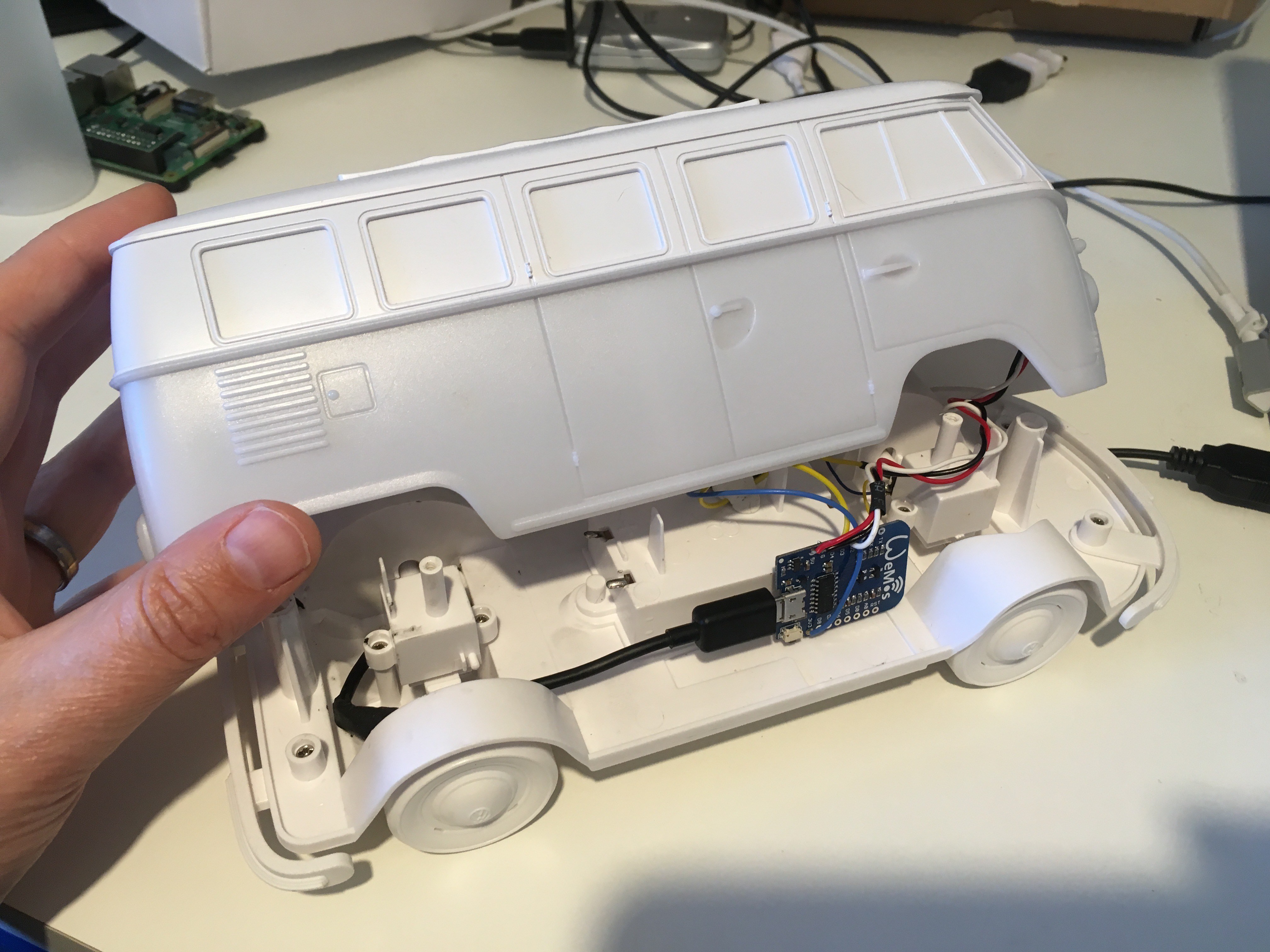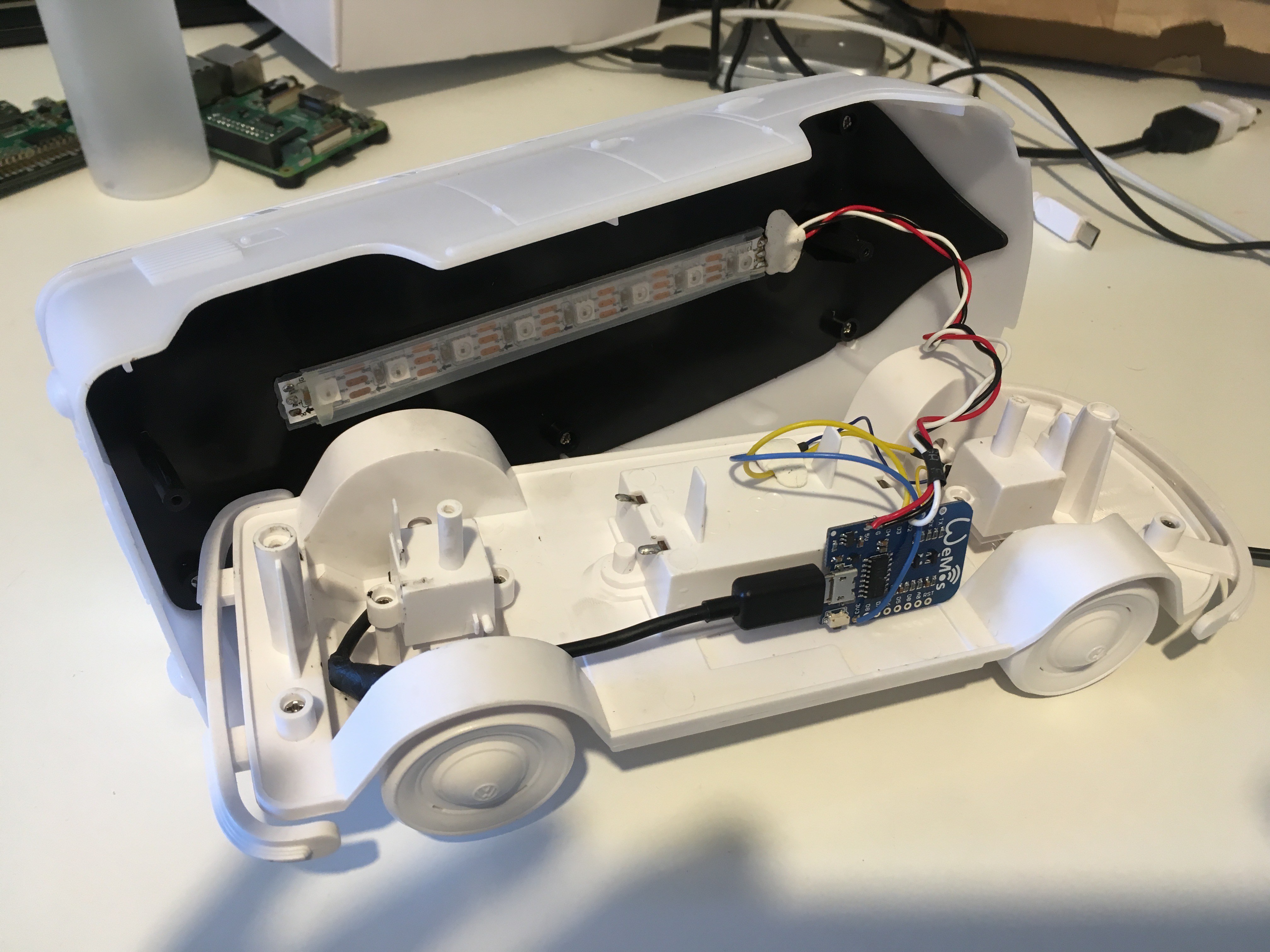 I had already hacked my camper van lamp. I used a Wemos D1 (ESP8266) and a strip of 8 neopixels.