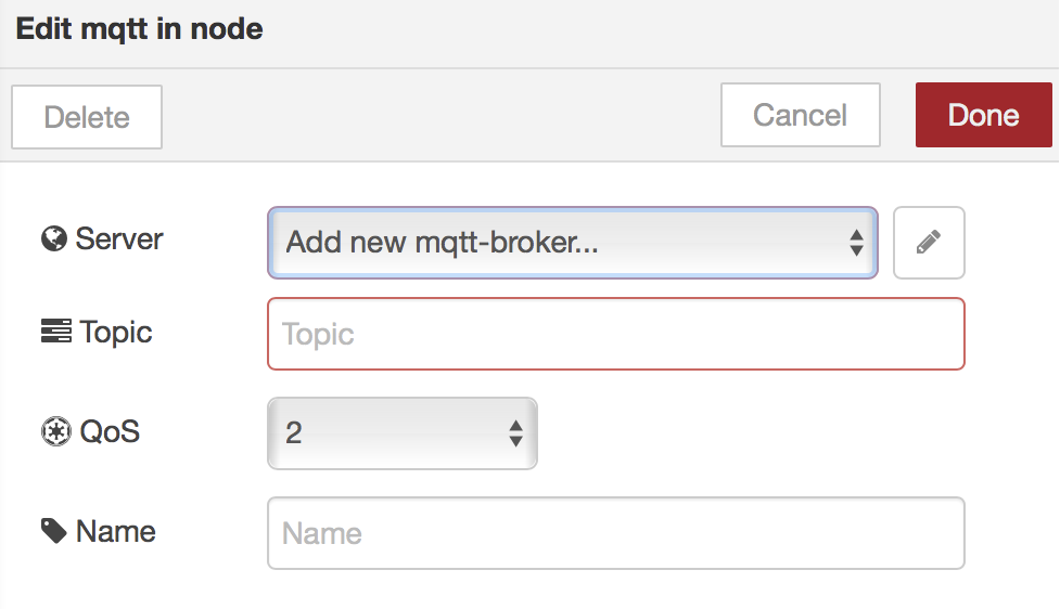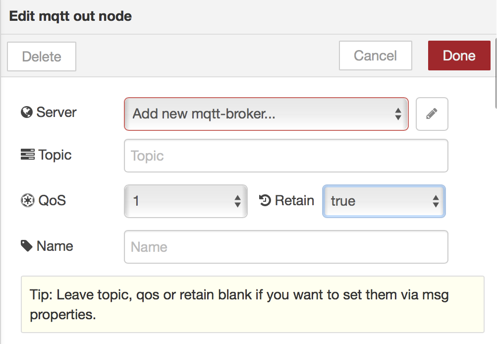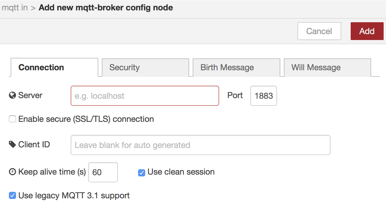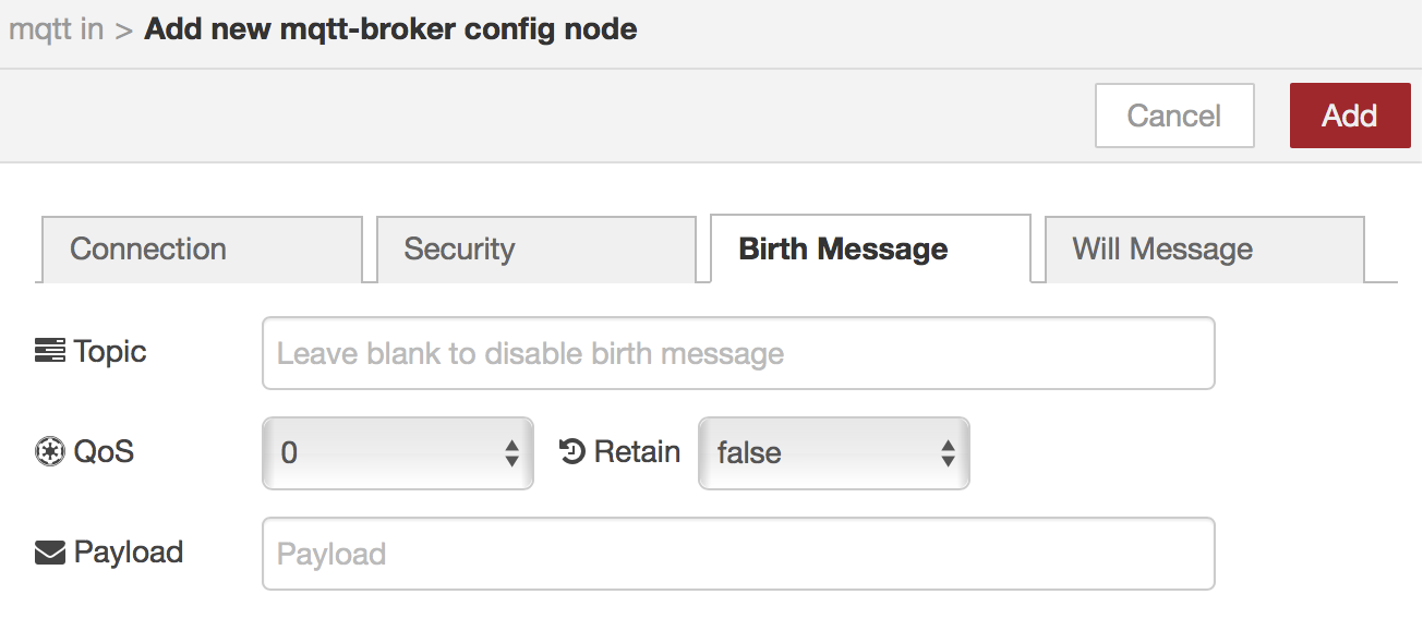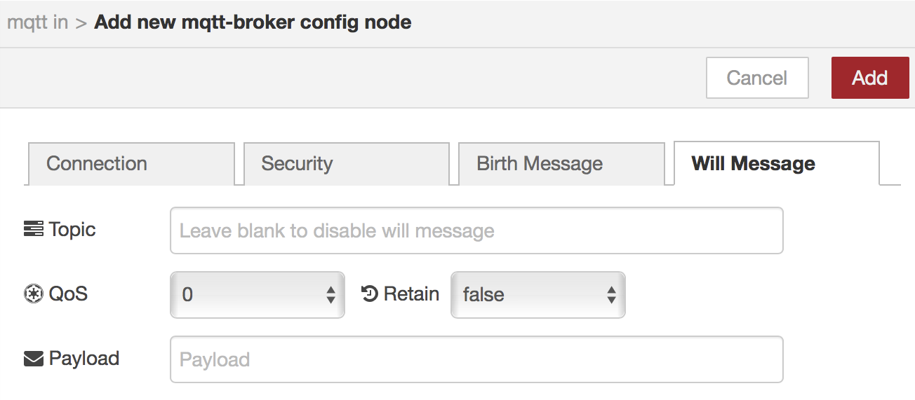 Node-RED MQTT input node Last Will and Testament settings for the MQTT broker configuration